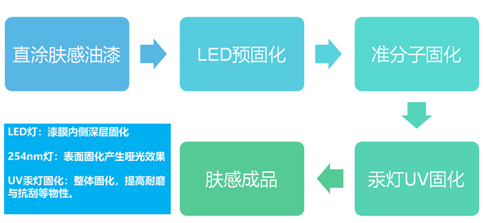 膚感漆+LED燈+準分子燈+汞燈固化,設(shè)備要求相對高。 |